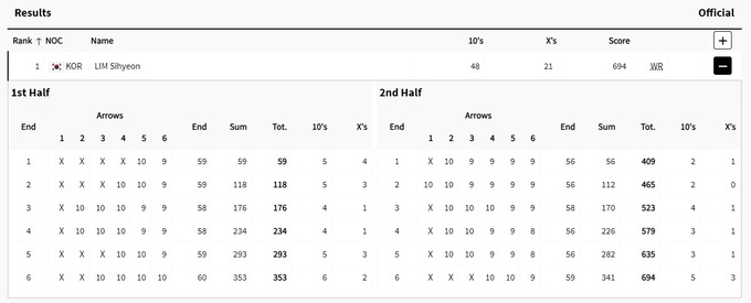 21-летняя Си Хён, которая занимает второе место в мировом рейтинге, закончила соревнования с показателем в 694 очка, максимальная возможная сумма – 720. Предыдущий мировой рекорд она улучшила на 2 очка.
