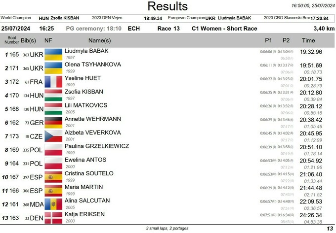 В соревнованиях на каноэ-одиночках Бабак заняла первое место, а Цыганкова – второе с отставанием в 18.73 секунды. Замкнула первую тройку француженка Иселин Юэ, которая проиграла Цыганковой почти пол-минуты.