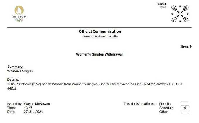 Lulu Sun replaces Yulia Putintseva in the women's singles draw 🇳🇿#Paris2024 | #Olympics | #tennis pic.twitter.com/xuWmvIiWCh