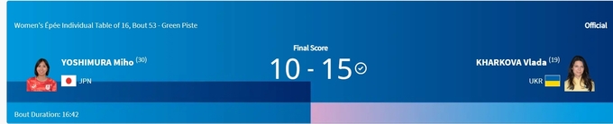 Украинка Влада Харькова пробилась в четвертьфинал Олимпиады-2024 по фехтованию на шпаге. Спортсменка в поединке 1/8 финала одолела представительницу Японии Йошимуру Михо.