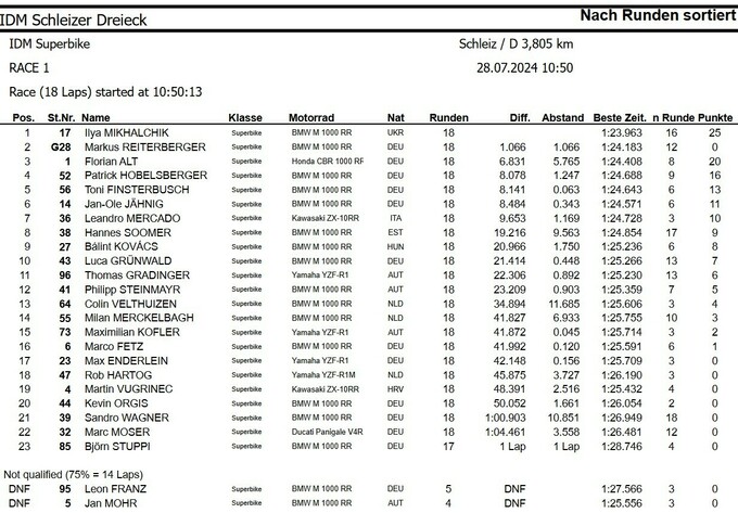 При этом лидер заводской команды BMW сделал хет-трик – выиграл гонку при старте с поула, а также установил лучший круг в гонке. После этой победы Михальчик вышел в лидеры чемпионата IDM 2024 и на три очка опережает Флориана Альта на Хонде, который финишировал третьим. Второе место занял Маркус Райтербергер, который выступает, как гостевой райдер.