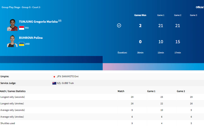Грегория Мариска Тунджунг (Индонезия) – Полина Бугрова (Украина) – 21:10, 21:15
