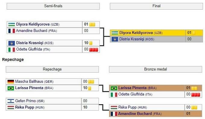 В финальном поединке женского турнира по дзюдо в весовой категории до 52 кг спортсменка из Узбекистана Диера Келдиерова одержала победу над Дистрией Красники из Косово.