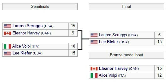 В полуфинале Лорен Скруггс (США) выиграла у Элеанор Харви (Канада) со счетом 15:9, а Ли Кифер (США) победила Алису Вольпи (Италия) со счетом 15:10. Таким образом, в поединке за золото между собой встретились две фехтовальщицы из США.