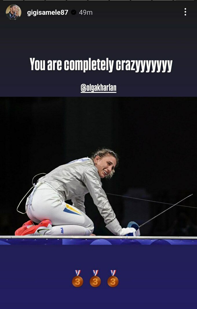 После завершения встречи итальянский фехтовальщик Луиджи Самеле, который является парнем Харлан, поздравил свою девушку с медалью: