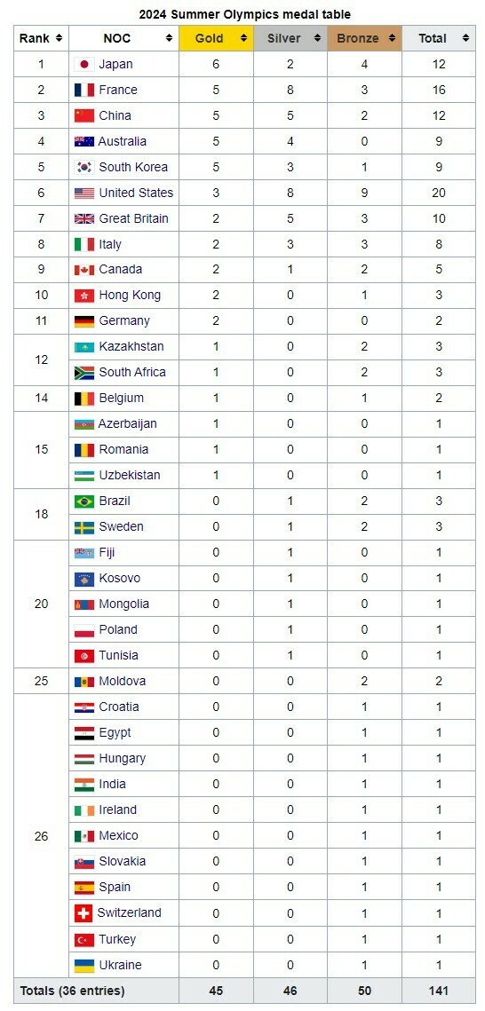 Лидирует в медальном зачете Япония, у которой 12 наград (6 золотых, 2 серебряных, 4 бронзовых). В топ-5 также входят Франция (5–8–3), Китай (5–5–2), Австралия (5–4–0), Южная Корея (5–3–1). И только 6-е место занимает команда США (3–8–9).