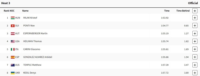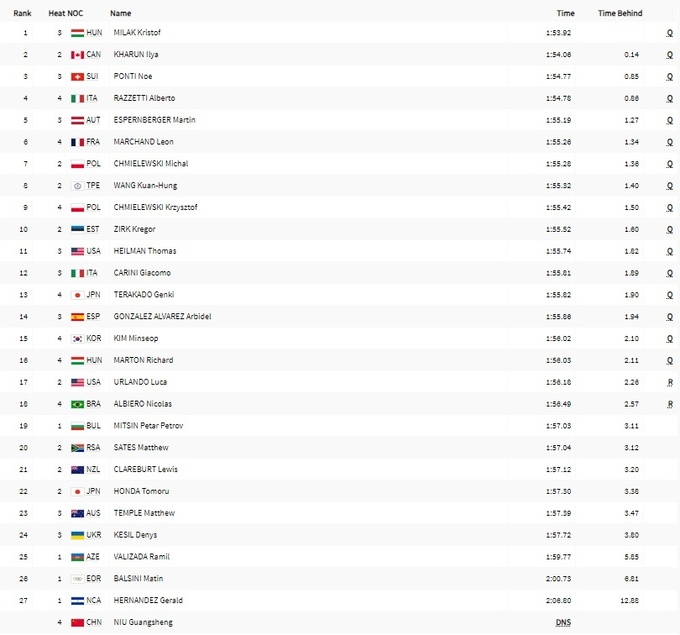 В своем заплыве 23-летний уроженец Кривого Рога показал 8-й результат при восьми участниках. Его время – 1:57.72.