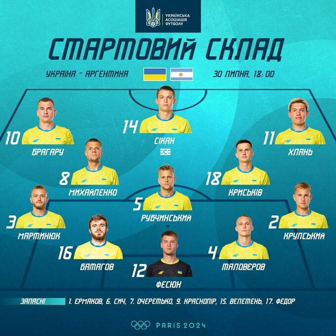 Состав Украины на решающий матч группы против Аргентины на Олимпиаде