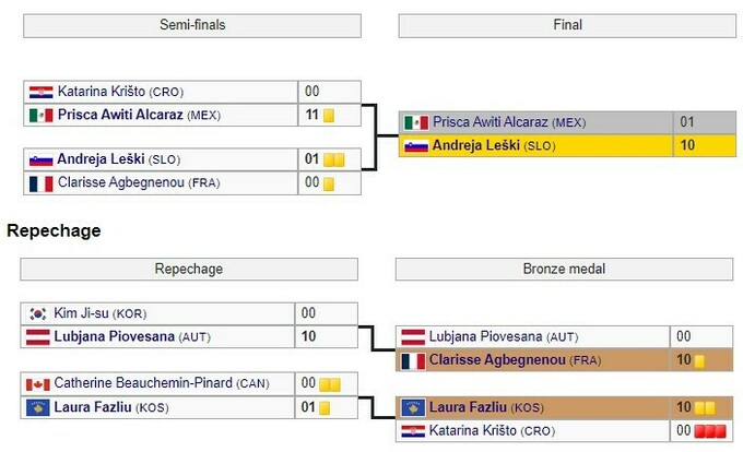 У женщин (до 63 кг) Андрея Лешки из Словении, победившая Кларисс Абгеньену из Франции в полуфинале, стала чемпионкой Игр-2024. Чемпионка же предыдущих Игр завоевала бронзу.