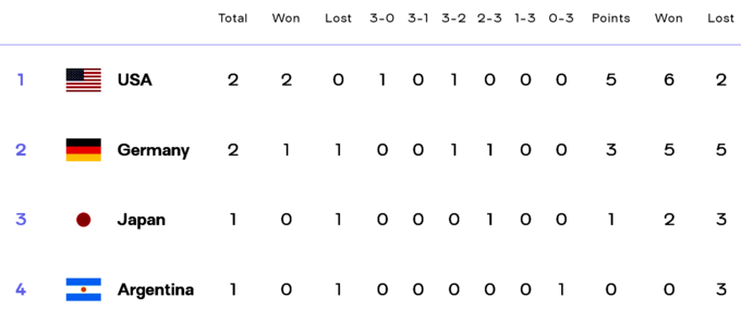 А в группе С сборная США в тяжелом пятисетовом матче обыграла Германию и тоже с пятью набранными очками может с оптимизмом смотреть на выход из группы.
