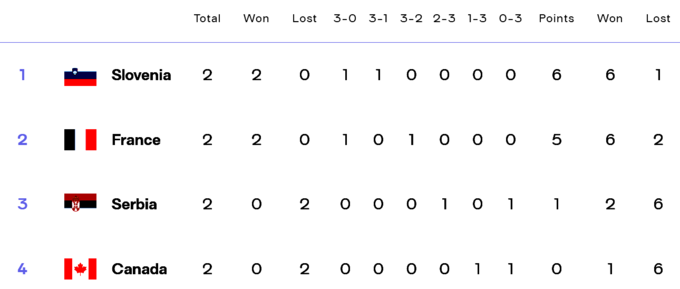 К примеру, в группе А уже стали известны две команды, которые гарантировали себе выход в четвертьфинал. Это сборная Словении, победившая сегодня Сербию 3:0, и волейболисты Франции также в трех сетах обыгравшие Канаду.