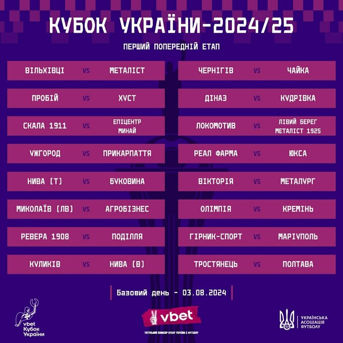 Дирекция по проведению Кубка Украины утвердила расписание матчей первого предварительного этапа турнира сезона 2024/25.