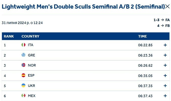 В полуфинальной гонке Хмара и Ковалев заняли пятое место. Победителям, итальянцам Стефано Оппо и Габриэлю Соаресу, украинские гребцы проиграли почти 15 секунд.