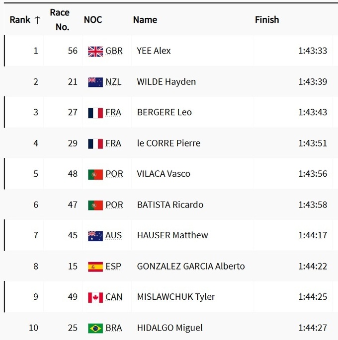 Британец Алекс Йи стал олимпийским чемпионом Игр 2024 года в Париже в мужском триатлоне. Он опередил новозеландца Хэйдена Уайлда и хозяина соревнований, француза Лео Бергера.