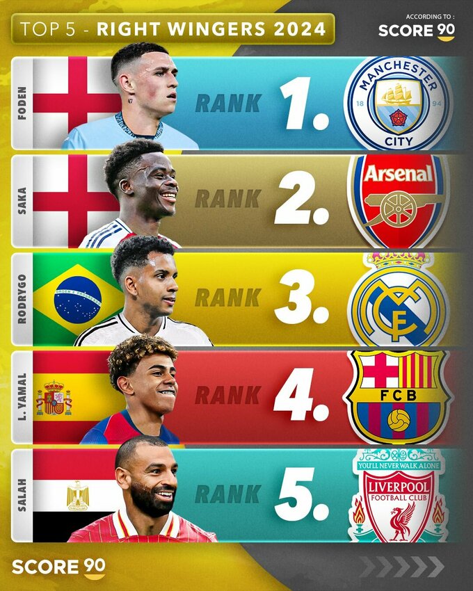 Первое место в рейтинге лучших правых вингеров занял игрок «Манчестер Сити» Фил Фоден, второй – Букайо Сака из «Арсенала», а третий – бразилец Родриго из «Реала».