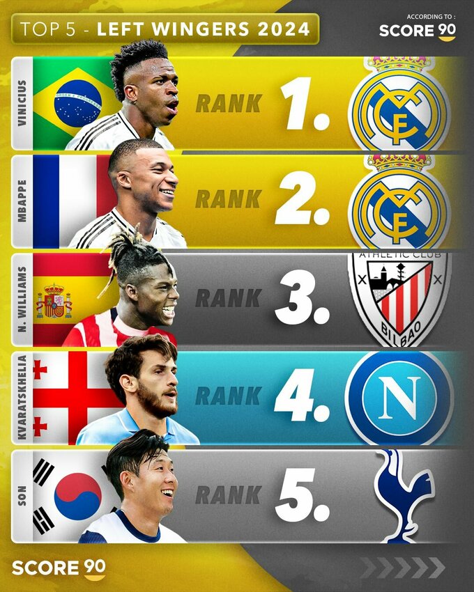 Рейтинг лучших левых вингеров мира по версии Score 90 в 2024 году