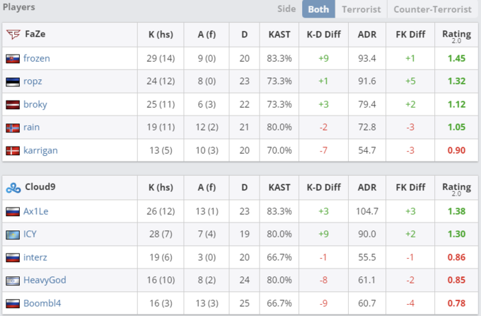 На десайдер команды оставили Mirage, где показали настоящую борьбу. Первая половина была крайне напряженной и завершилась со 7:5 в пользу FaZe. Во второй части решающей карты, Cloud9 сумели прийти в себя и взяли 5 раундов к ряду, сделав счет 10:7 в свою пользу, а позже и вовсе первые пришли к матчпоинту: 12:10. В казалось бы последнем раунде основного времени «облака» были в численном преимуществе 4 в 2, однако игроки FaZe чудом вытащили эту ситуацию, а позже свели матч к овертаймам. На дополнительном времени датчане уже дожали соперника и одолели Cloud9 со счетом 16:14.