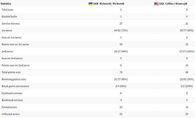 Во 2-м раунде украинки в трех сетах одолели американский тандем Даниэль Коллинс / Дезире Кравчик за 1 час и 40 минут.