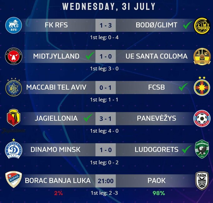 Вечером 31 июля состоялись ответные матчи второго раунда квалификации Лиги чемпионов 2024/25.