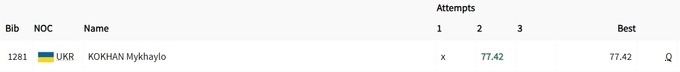 Первая попытка квалификации оказалась у украинца неудачной. Зато во второй – он смог отправить молот на 77.42 м. Тем самым, Кохан выполнил контрольный норматив, что позволило ему завоевать путевку в финал соревнований.