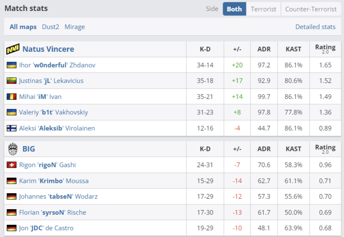 Первой картой в противостоянии стал выбор BIG – Dust 2. Первая половина завершилась со счетом 8:4 в пользу «рожденных побеждать», а во второй части карты NaVi просто дожали противника и закрыли карту со счетом 13:7.