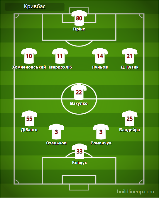 «Кривбасс»: Клищук – Дибанго, Стецьков, Романчук, Бандейра – Вакулко (Бизимана, 83) – Хомченовский (Микитишин, 46), Твердохлеб, Лунев (По, 68), Д. Кузык (Соса, 69) – Принс (Кожушко, 75).