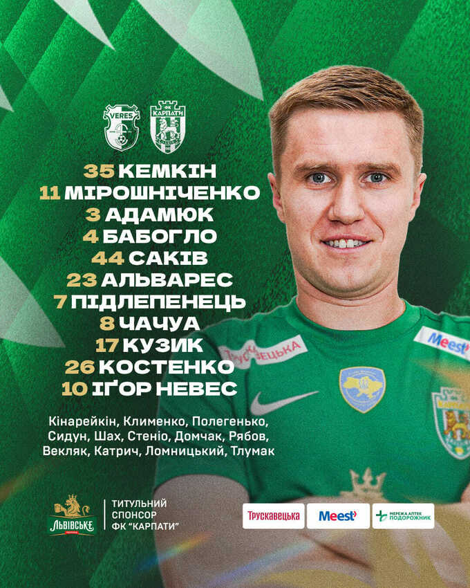 Карпаты: Кемкин, Сакив, Бабогло, Адамюк, Мирошниченко, Альварес, Кузык, Чачуа, Костенко, Подлепенец, Невес