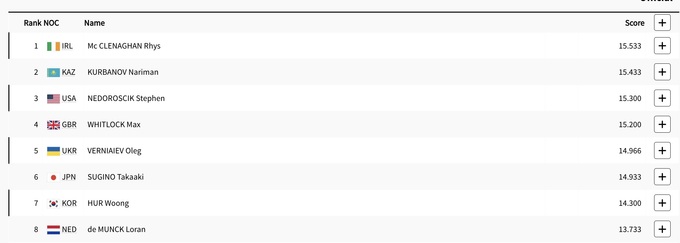 Лидер сборной Украины завершил соревнования с результатом в 14.966 балла, что позволило занять ему пятое место. Золото взял ирландец Мак-Кленаган, чье выступление оценили на 15.533 балла.