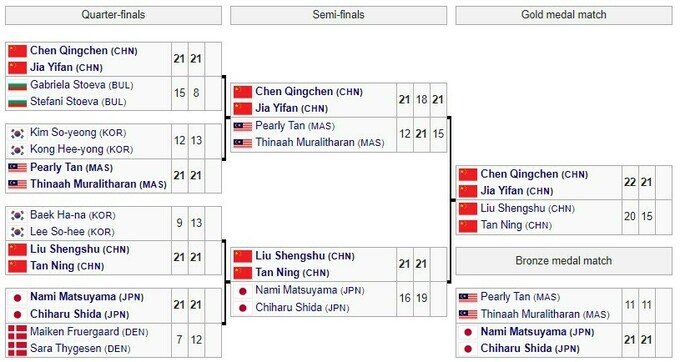 Третье место занял дуэт из Японии Нами Мацуяма / Чихару Сида, победивший в матче за бронзу дуэт из Малайзии – 21:11, 21:11.