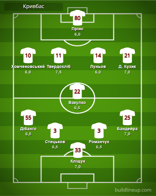 «Кривбасс»: Клищук – Дибанго, Стецьков, Романчук, Бандейра – Вакулко (Бизимана, 83) – Хомченовский (Микитишин, 46), Твердохлеб, Лунев (По, 68), Д. Кузык (Соса, 69) – Принс (Кожушко, 75).