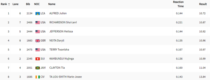 Фаворитка соревнований Ша'Карри Ричардсон стала второй (10.87). Американка просто заснула на старте. У Ша'Карри худший показатель реакции на старте – 0.221 сек.