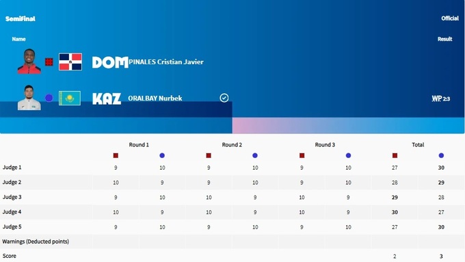 В весовой категории до 80 кг в финал вышел представитель Казахстана Нурбек Оралбай, который одолел доминиканца Кристиана Хавьера Пиналеса.