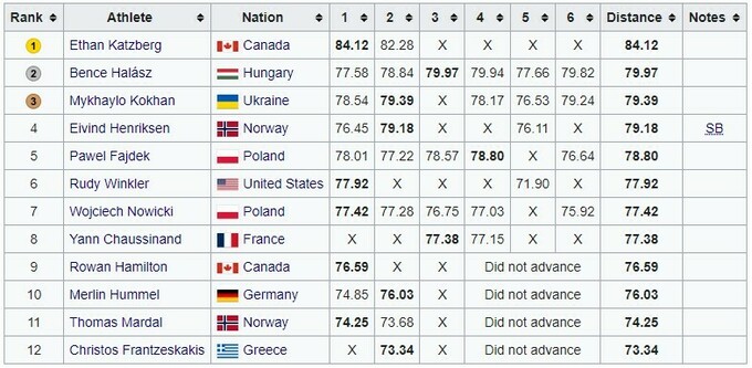 Только двое спортсменов показали более высокие результаты. Итан Кацберг из Канады взял золото с очень высоким результатом (84.12 м), а серебряную медаль завоевал Бенце Халас из Венгрии (79.97 м).