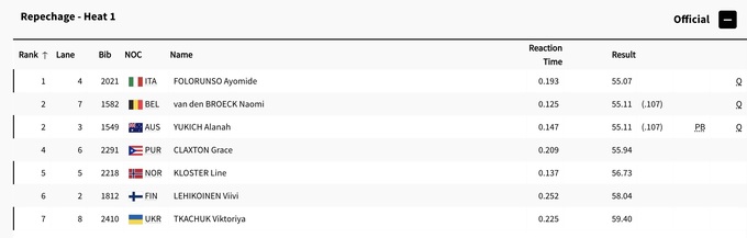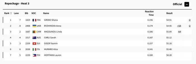 Вторым шансом воспользовались лишь Анна Рыжикова, которая прошла в полуфинал Олимпиады-2024. В утешительном забеге украинская бегунья финишировала второй с личным рекордом сезона (54.95 секунд). Виктория Ткачук вне финала (59.40 секунд).
