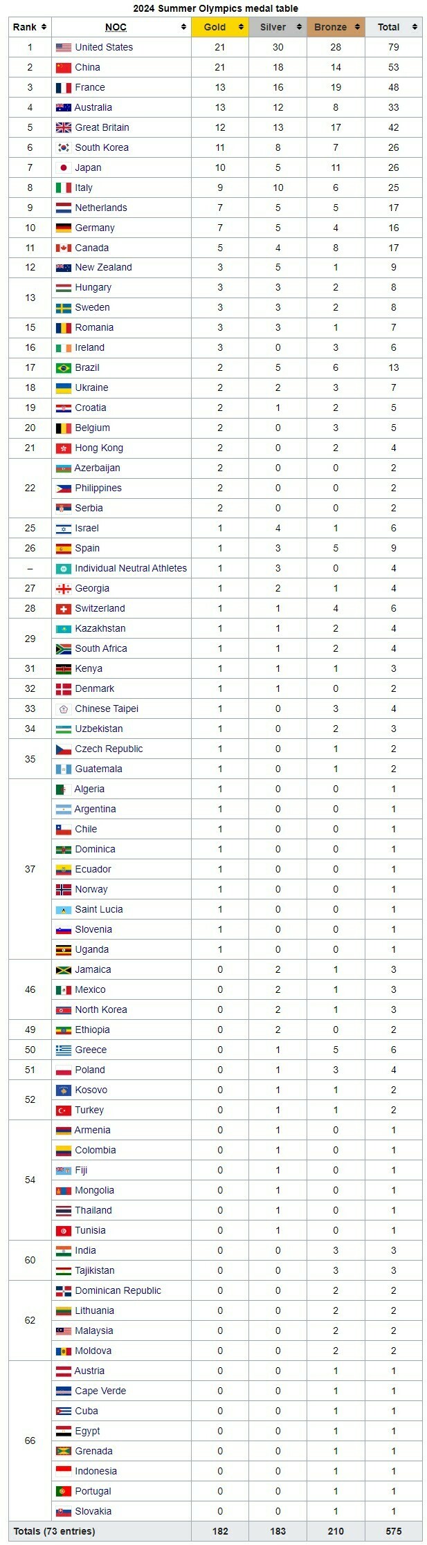 В медальном зачете упорную борьбу за лидерство ведут США (21–30–28) и Китай (21–18–14). В топ-5 также входят Франция (13–16–19), Австралия (13–12–8), Великобритания (12–13–17).