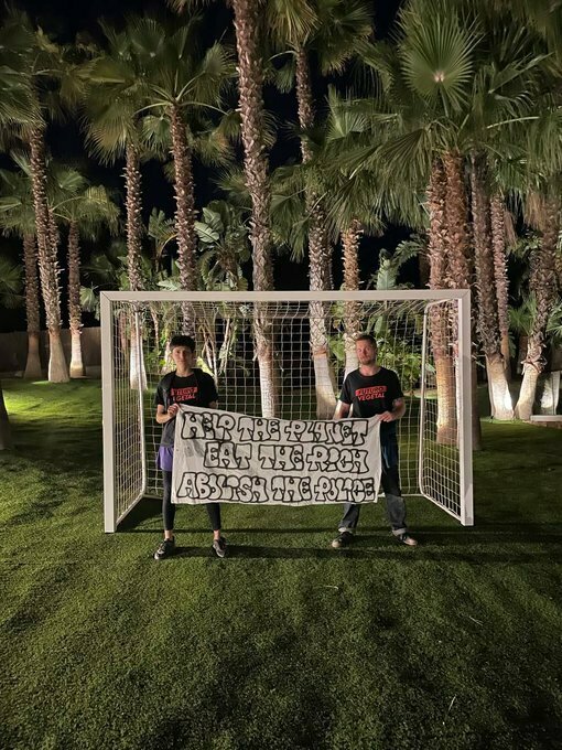 Климатические активисты пробрались на виллу этим утром, облив ее фасад красной и черной краской. Они сфотографировались с плакатом, на котором было написано: «Помогите планете – ешьте богатых, упраздните полицию».
