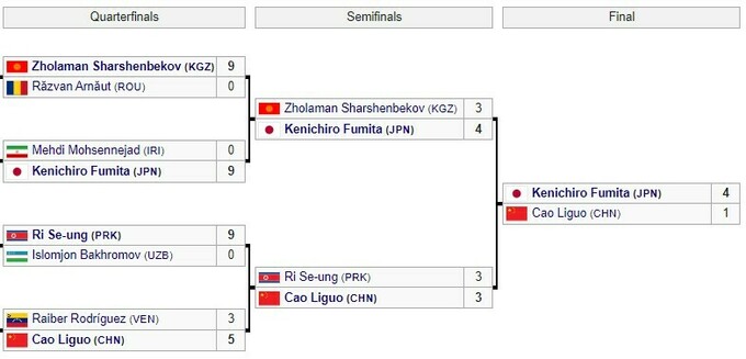 Он выиграл в финале у китайца Цао Лигуо. Бронза досталась спортсменам из Северной Кореи и Кыргызстана.