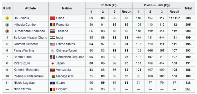 Хоу Чжихуэй из Китая выиграла в Париже свое второе после Токио-2020 олимпийское золото в тяжелой атлетике в весовой категории до 49 кг. При этом установила олимпийский рекорд в толчке (117 кг).