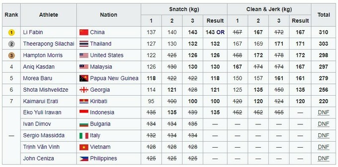 Установлен новый олимпийский рекорд в рывке среди мужчин в весовой категории до 61 кг.