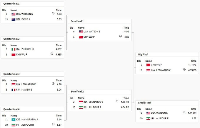 Золотую медаль в бескомпромиссной борьбе выиграл спортсмен из Индонезии Веддрик Леонардо, который в финальном раунде всего на 2 сотые секунды опередил китайца Ву Пэна – 4.75 и 4.77. Что интересно, оба атлета показали в финале лучшие результаты в карьере.