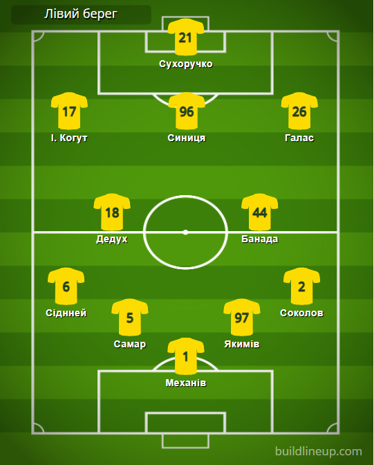 «Левый берег»: Механив – Сиднней (Непейпиев, 69), Самар, Якимив, Соколов – Дедух, Банада – И. Когут (Астахов, 62), Синица, Галас (Спиваков, 62) – Сухоручко.
