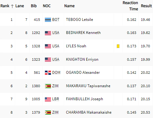 Золотую медаль выиграл Летсиле Тебого из Ботсваны, который преодолел дистанцию за 19.46 секунд. Он принес для своей страны первое золото в истории.
