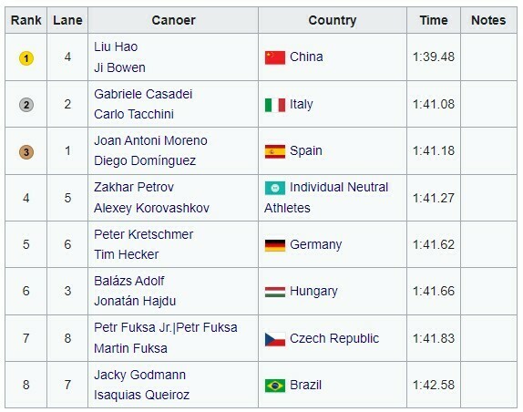 В каноэ-двойках среди мужчин в топ-тройку вошли команды Китая, Италии и Испании.