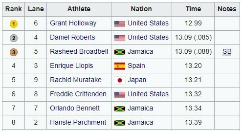 Американец Грант Холлоуэй завоевал золото в беге на 110 метров с барьерами, пробежав дистанцию за 12.99 сек. Второе место занял американец Дэниел Робертс, а бронзовую медаль получил Рашид Броудбелл из Ямайки.