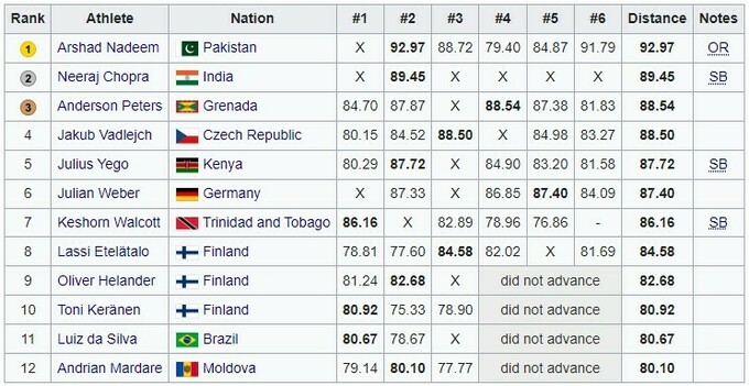 Аршад Надим из Пакистана установил новый олимпийский рекорд в метании копья, отправив снаряд на 92.97 м. В топ-3 также вошли Нирай Чопра (Индия) и Андерсон Петерс (Гренада).