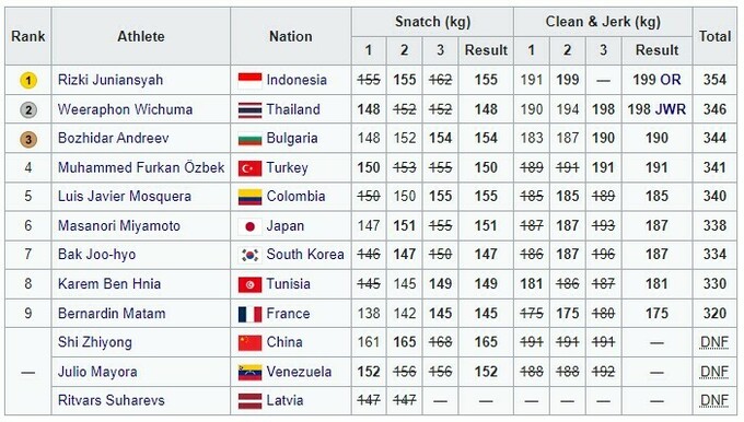 Ризки Джуниансья из Индонезии сенсационно стал чемпионом ОИ в категории в категории до 73 кг среди мужчин, установив олимпийский рекорд в толчке (199 кг). В сумме двоеборья он набрал 354 кг.
