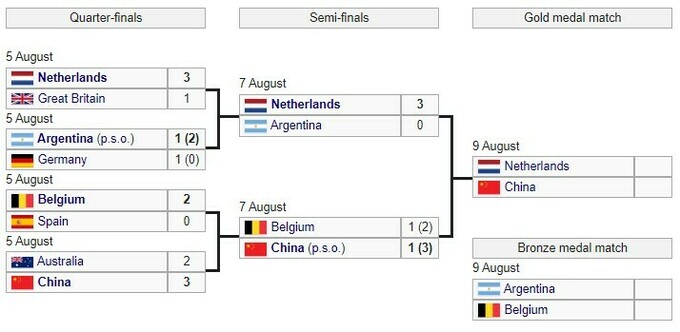 Решающие матчи в хоккее на траве среди женщин пройдут 9 августа. В финале сыграют Нидерланды и Китай, а бронзовые медали разыграют Аргентина и Бельгия.