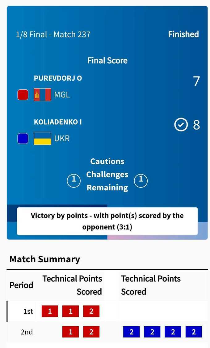 Схватка завершилась в пользу украинки со счетом 8:7, хотя после первого периода она проигрывала 0:4.