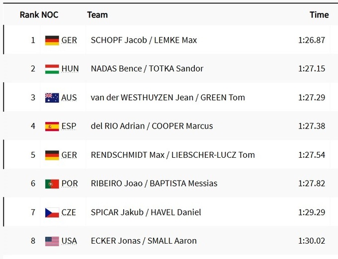 В соревновании байдарок-двоек победил немецкий дуэт Якоб Шопф/Макс Лемке. В финале они опередили венгерский дуэт Бенце Надаш/Шандор Тотка и команду Австралии (Жан ван дер Вестхуйзен/Том Грин).