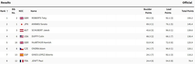 На ОИ-2024 в Париже завершились соревнования в скалолазании у мужчин в двоеборье (боулдеринг и трудность).
